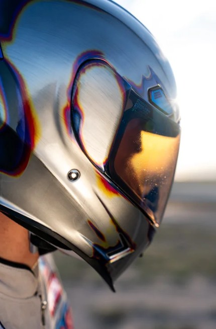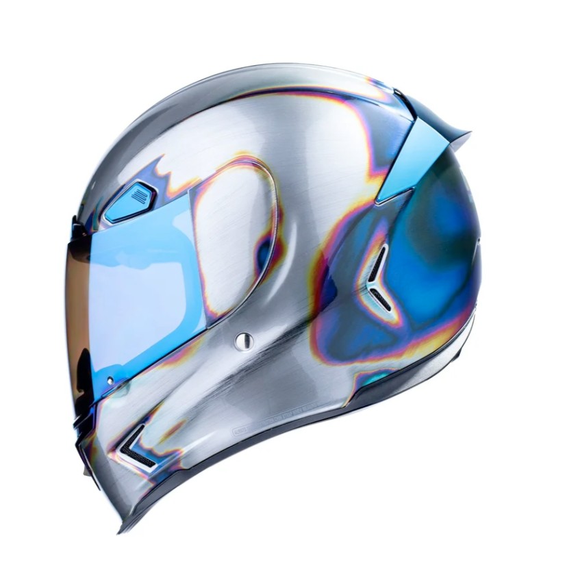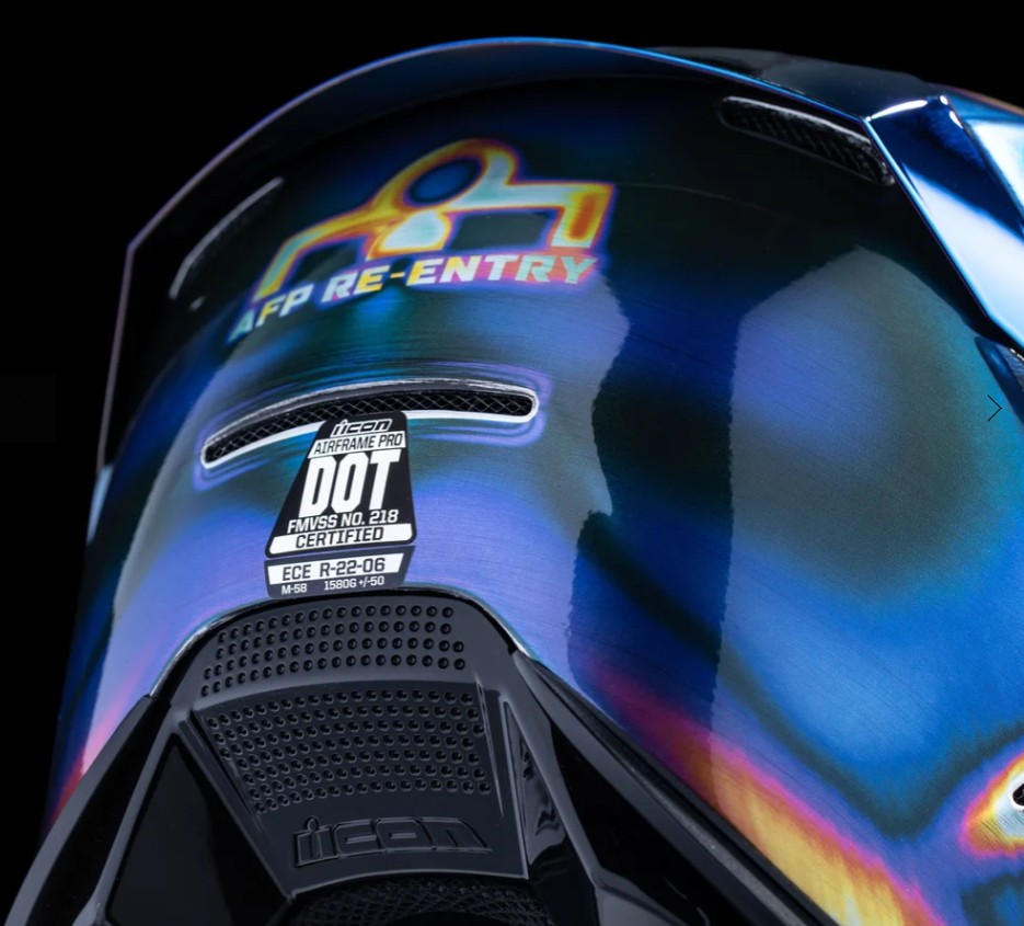 El casco AirframePro Reentry presenta un gráfico de alta temperatura que funde metal sobre una carcasa de fibra de vidrio FRP hecha a mano. El material de la carcasa es resistente pero ligero, y su forma está diseñada para minimizar la resistencia aerodinámica, tanto en la pista como en la calle. Este casco, con certificación DOT/ECE/PSC, cuenta con la forma de cabeza intermedia-ovalada de ICON, ideal para la mayoría de los pilotos. Presencia tu regreso de las estrellas a través de la pantalla Fog-Free Optics™ sin distorsión.